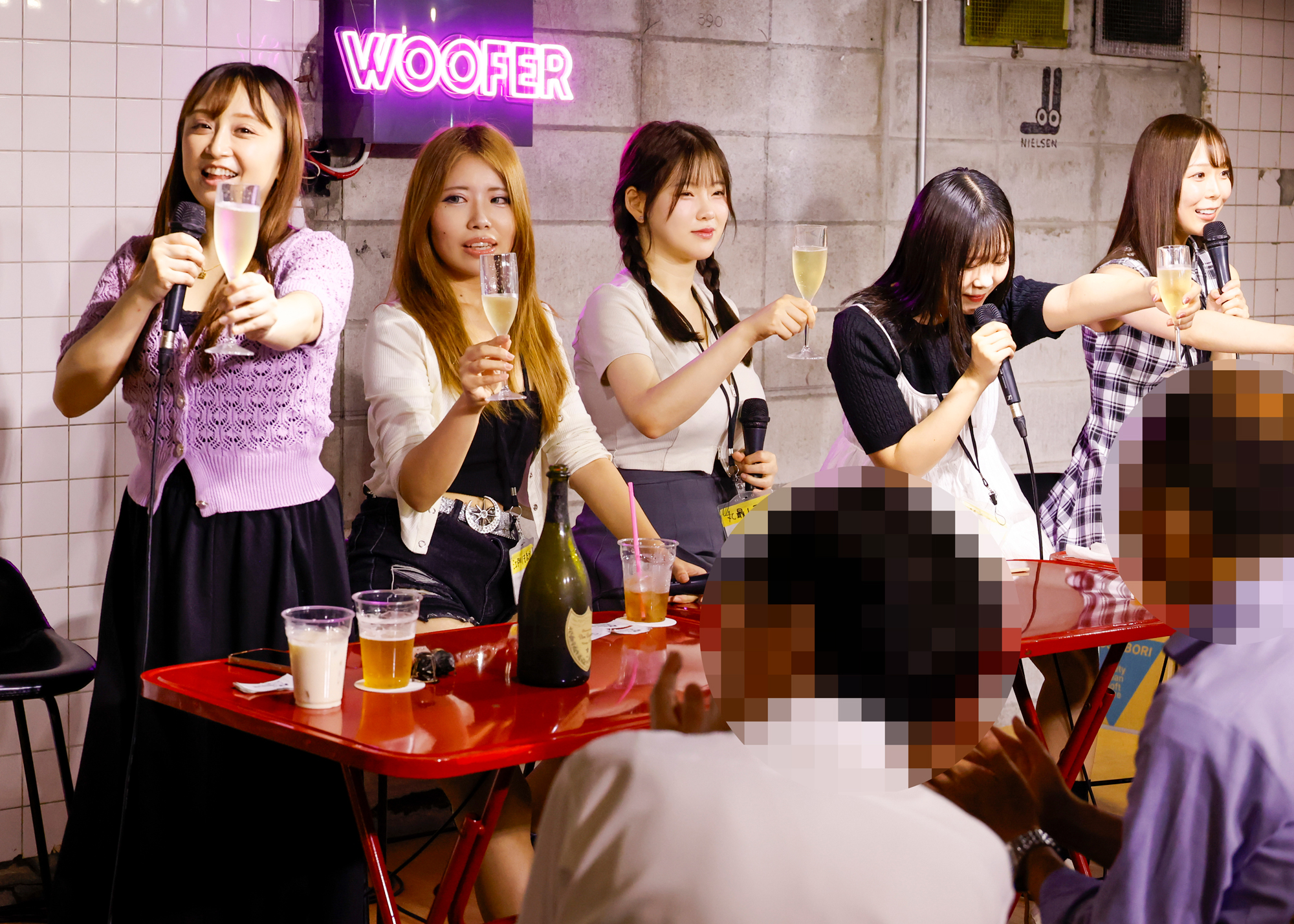 今回の出演者は、MCを務めるきみと歩実ちゃん(以下、あゆみんパイセン)を筆頭に、音羽美鈴ちゃん、江戸川もなかちゃん、久和原せいらちゃん、そして初参加のフレッシュな丸最レアちゃんという個性豊かな面々が勢ぞろい! ステージに登場した5人は笑顔で自己紹介を済ませ、乾杯とともにイベントが本格スタート。