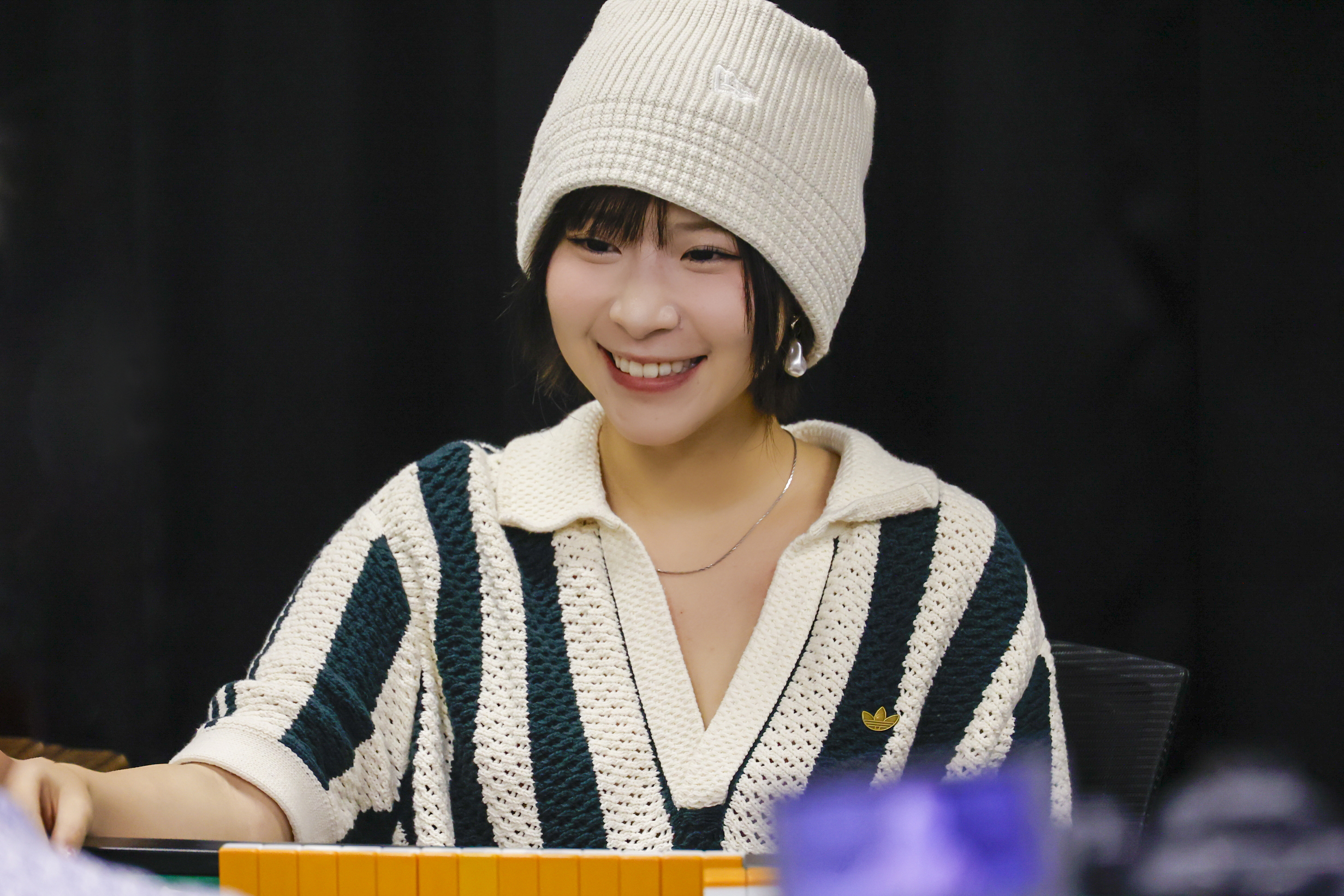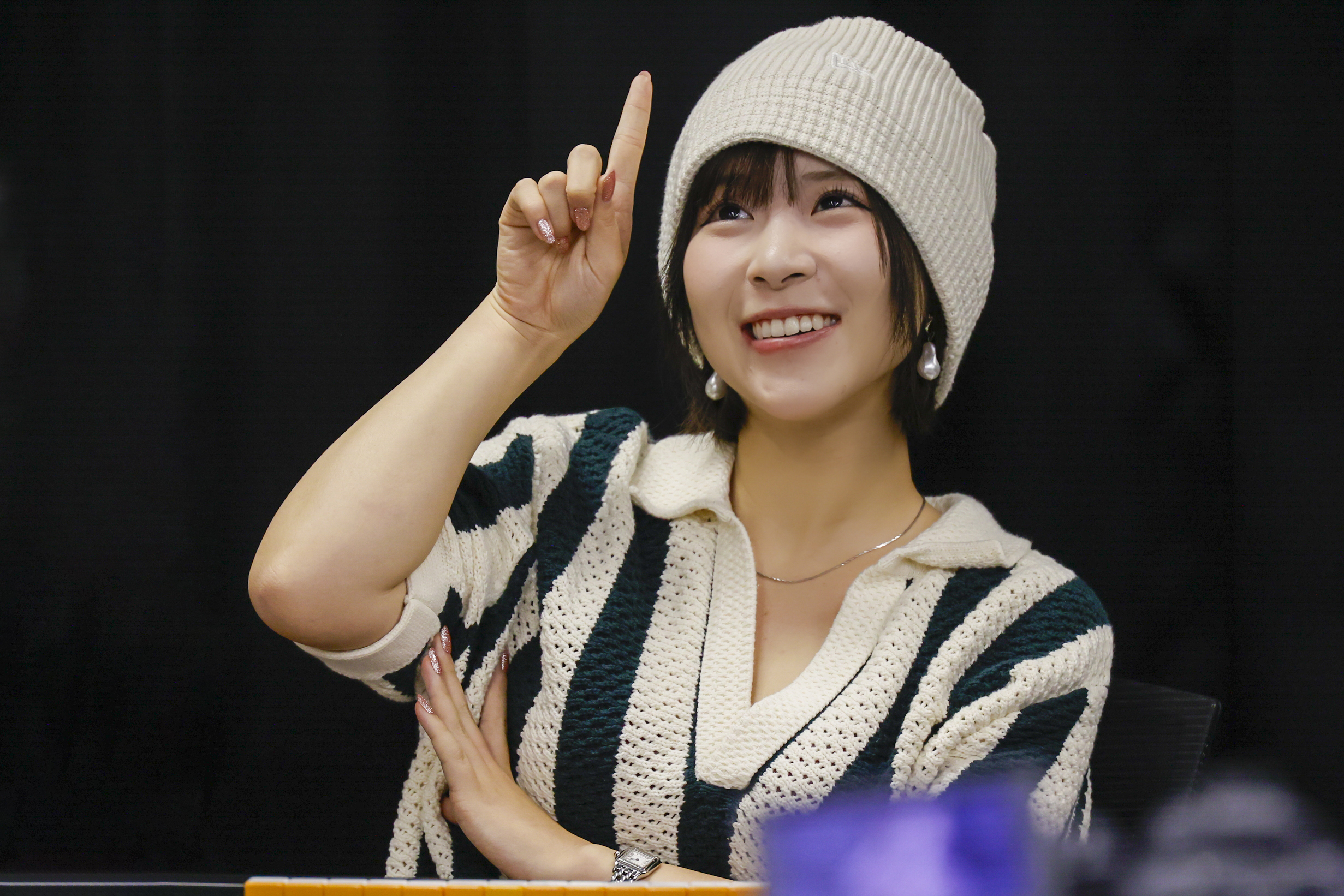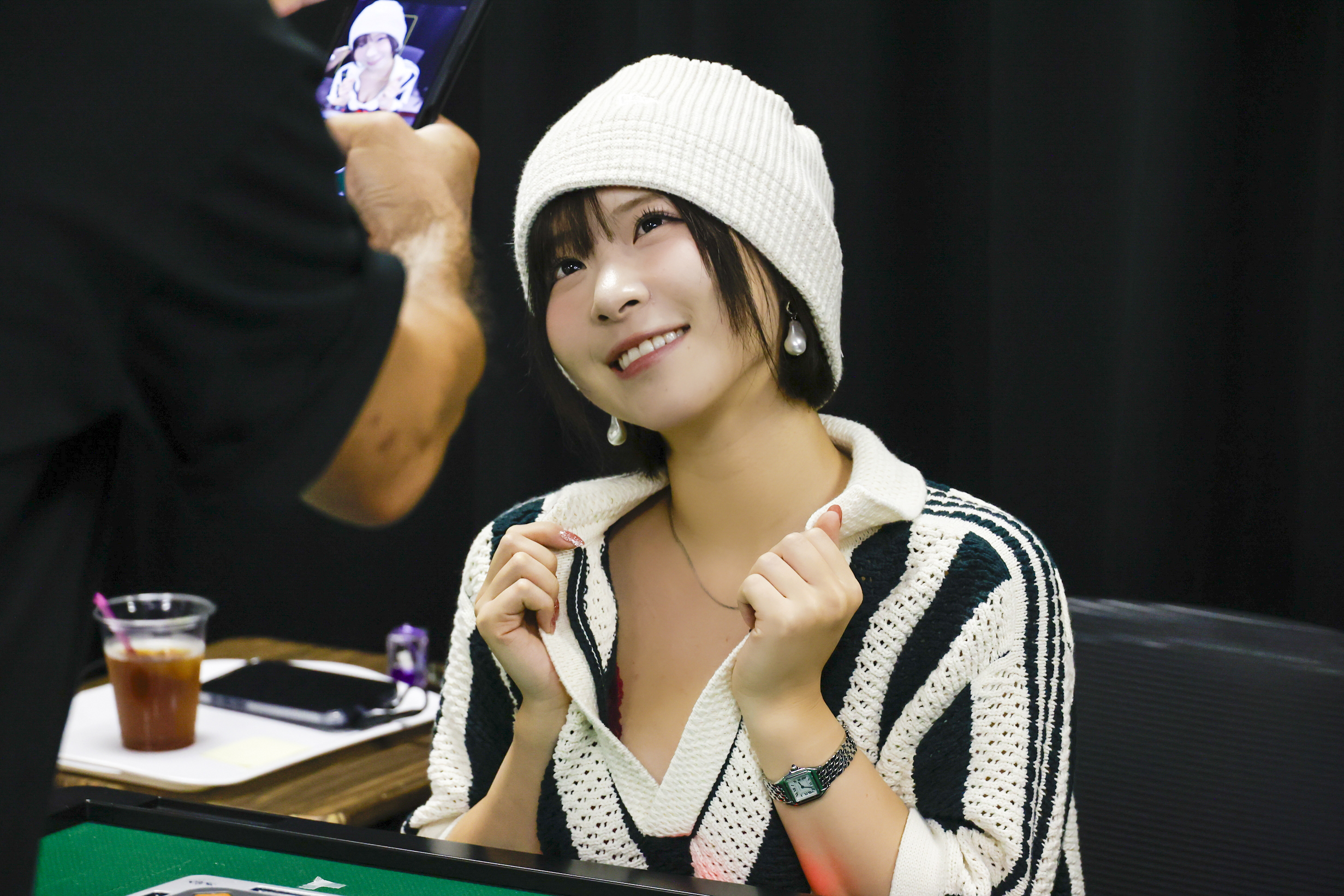 イベントはまず「撮影タイム」からスタート。対局に参加する3名のファンが順番に、麻雀卓を挟んでの超近距離で撮影できるというもの。カメラを向けると、そこには満面の恵奈ちゃんスマイル。ふわっと場が和んで、参加者も自然とリラックス。開始早々、恵奈ちゃんの持つ親しみやすさが存分に発揮されました。