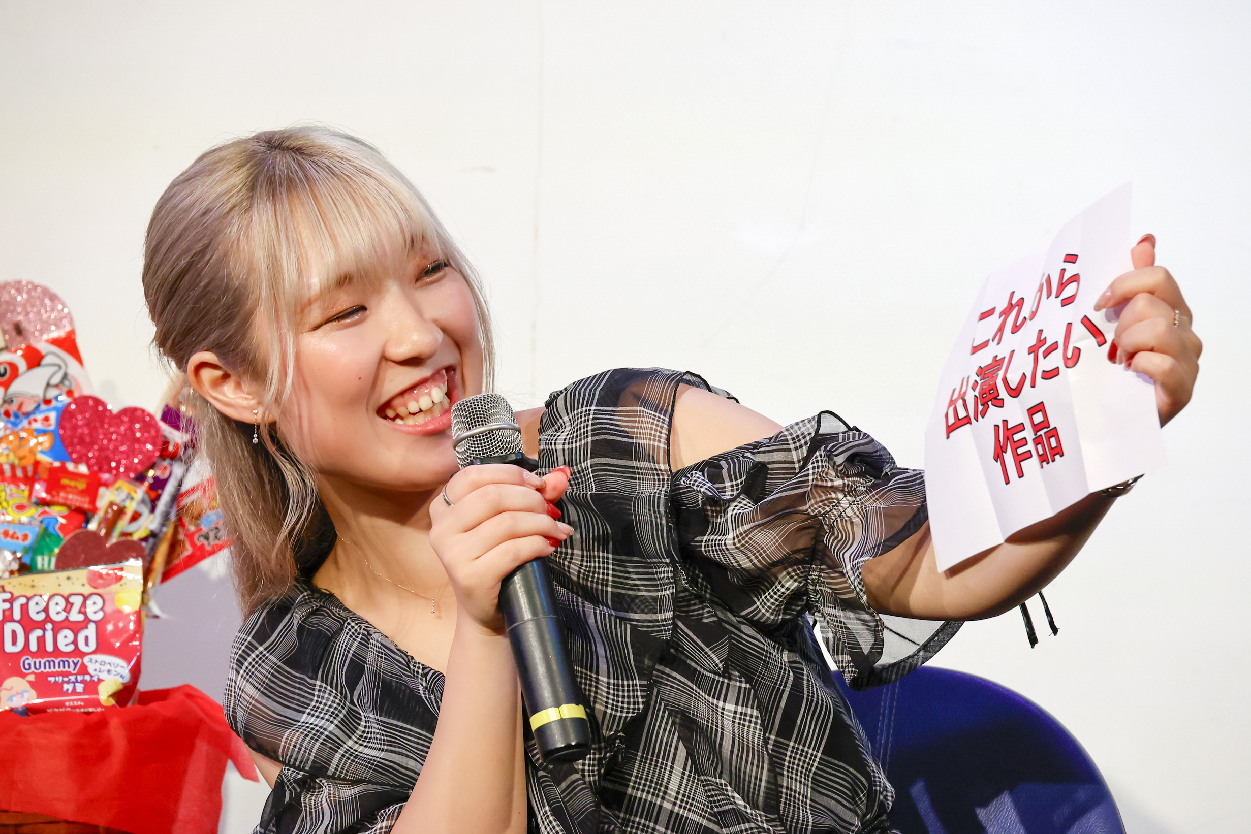自己紹介フリップの裏側にはエッチなテーマも用意されており、「エッチな特技はクリトリスなら無限に行けます。企画名みたいに『クリなら無限イキ』(笑)」と某人気アニメを彷彿とさせるネタで会場を沸かせます。