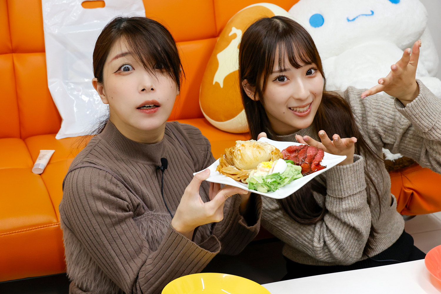 また、焼き鳥には激辛一味をたっぷりかけて挑む2人でしたが、意外と平気な顔で完食。さらに回転寿司、スパークリングワインと豪華差し入れの波が止まらず、みのりちゃんはマグロ、みっひーはサーモンをチョイス。