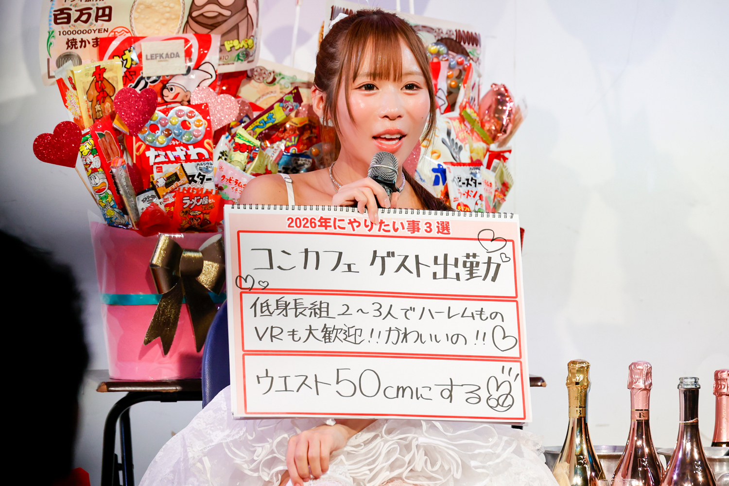 最後に「2026年にやりたいこと3選」として、「コンカフェにゲスト出勤したい」と熱望。さらに、「低身長女優でハーレム作品を撮りたいです。由良かなちゃんとかがいいかな」と、共演してみたい女優の名前も挙げます。そして「ウエストを50センチにする」と目標を掲げ、フリップには書いていなかったものの、「冠イベントももっと盛り上げたい!」と意気込みを語ってくれました。