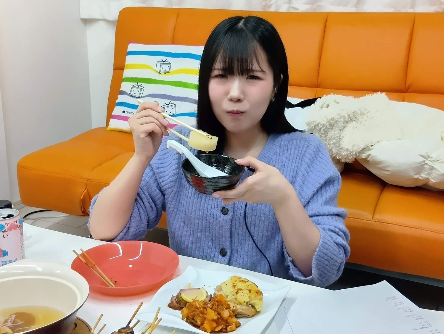 ここで無料配信時間が終了。有料配信時間に突入します。有料配信に切り替わると「ここからが本番です!」と宣言し、目の前には配信恒例の熱々おでんが用意されます。ぐつぐつと煮えたぎるおでんの中から、あえて一番熱い玉子をチョイス。